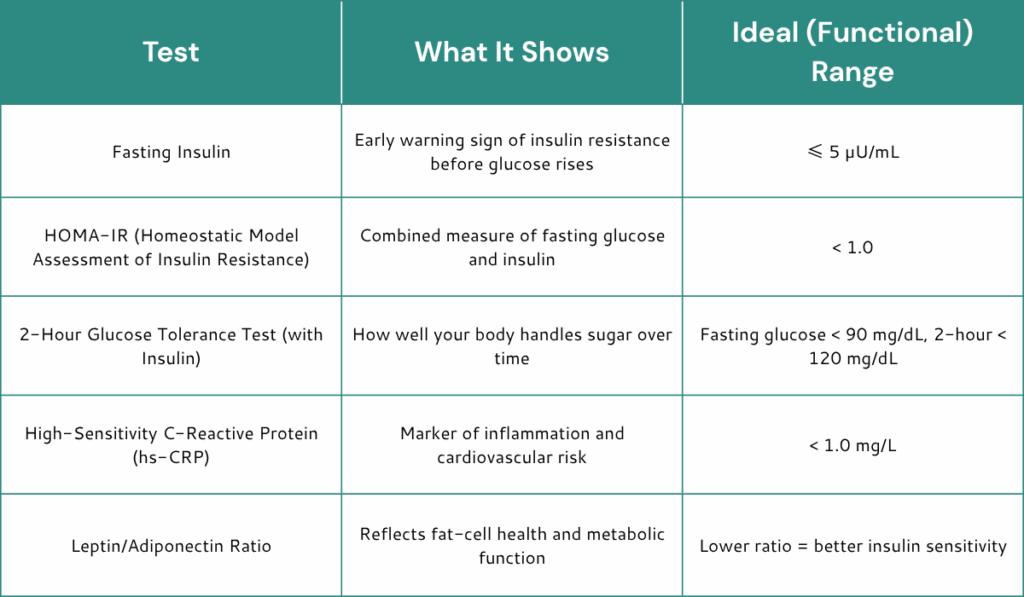 If you only run one or two of these, start with fasting insulin and hs-CRP. They’ll often reveal early problems long before fasting glucose or A1c rise out of range.